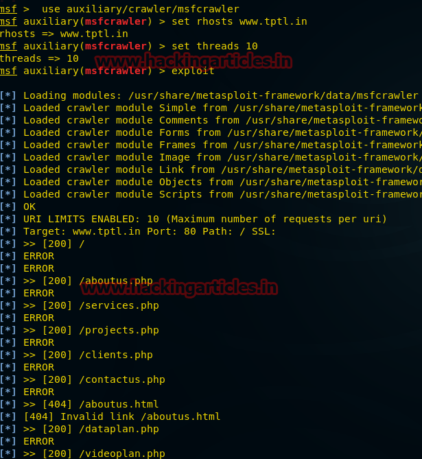 From, the screenshot you can see it has loaded crawler in order to exact hidden file from any website, for example, about.php, jquery contact form, html and etc which is not possible to exact manually from the website using the browser. For information gathering of any website, we can use it.